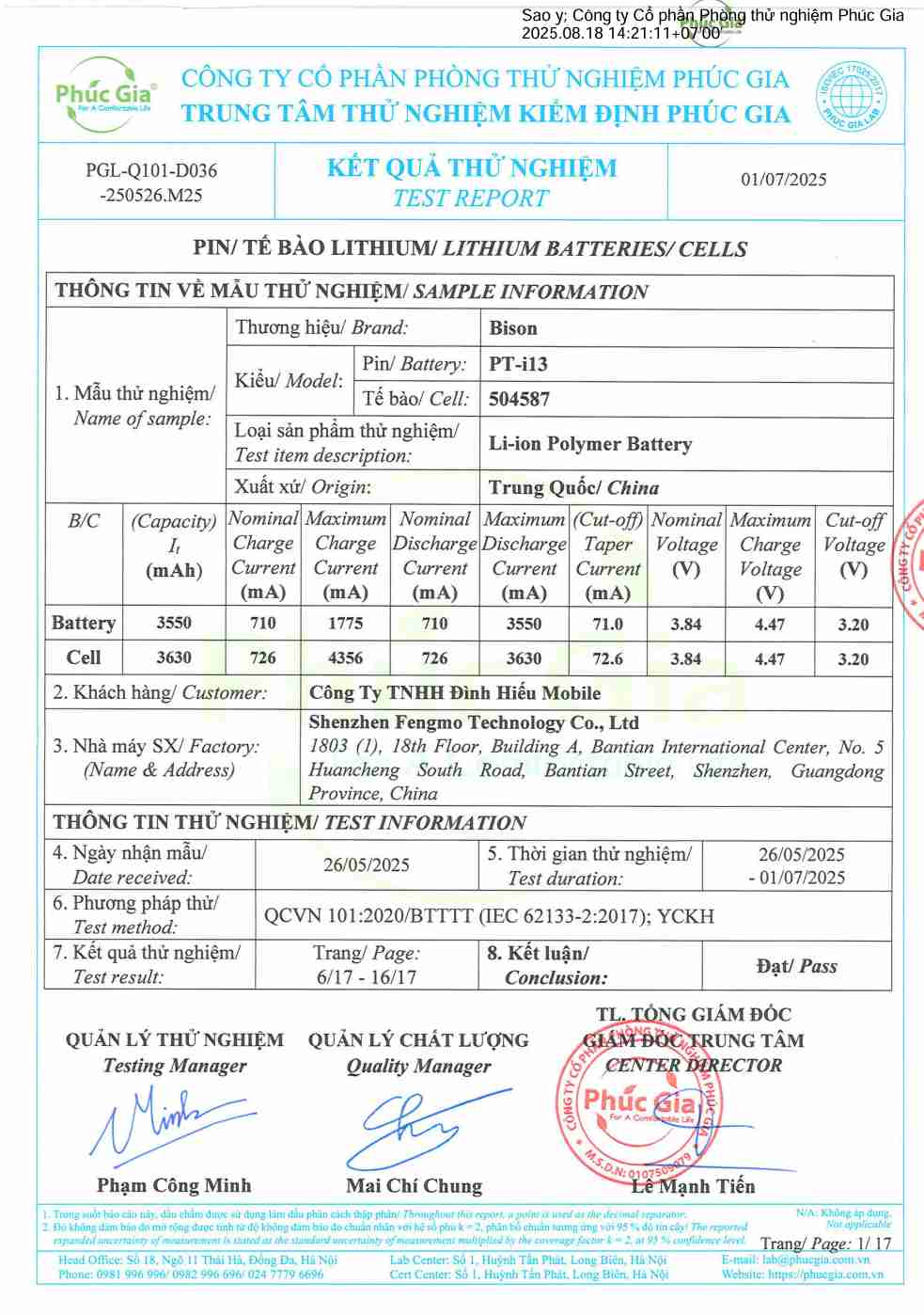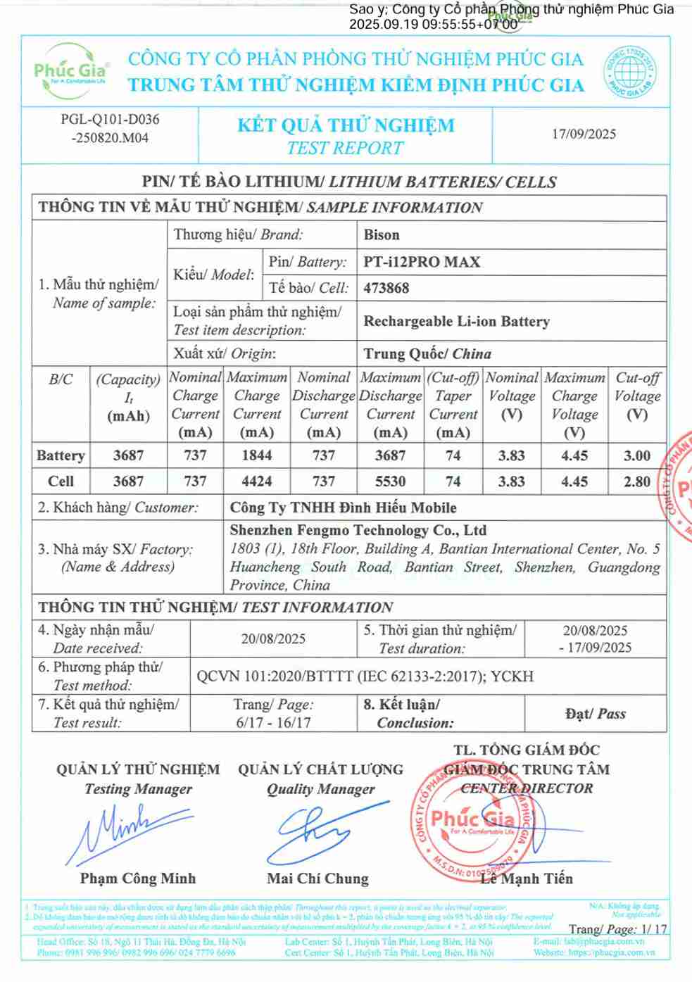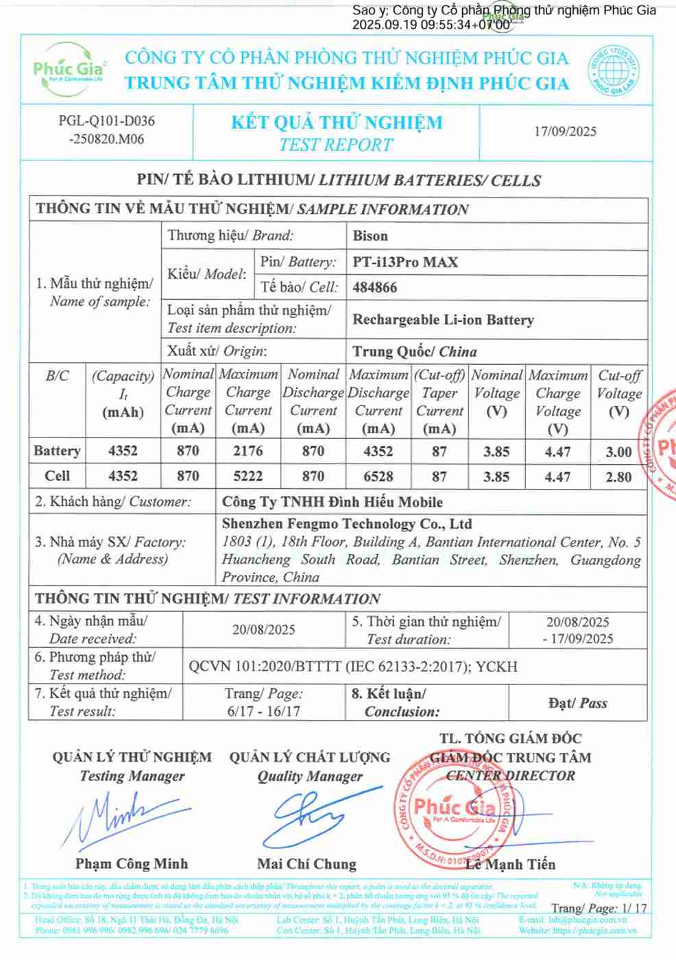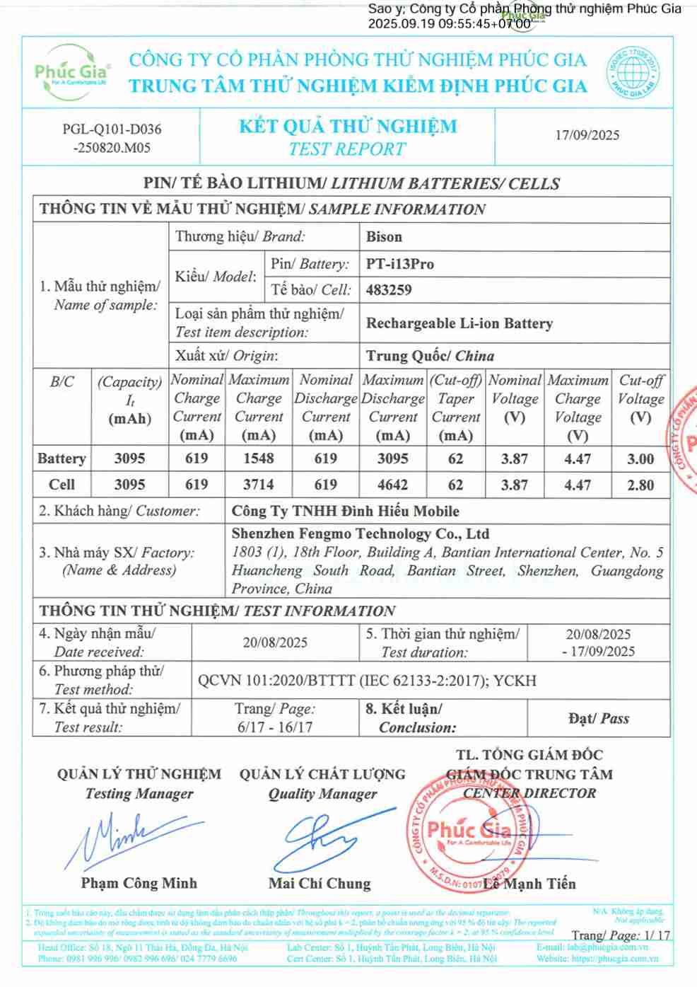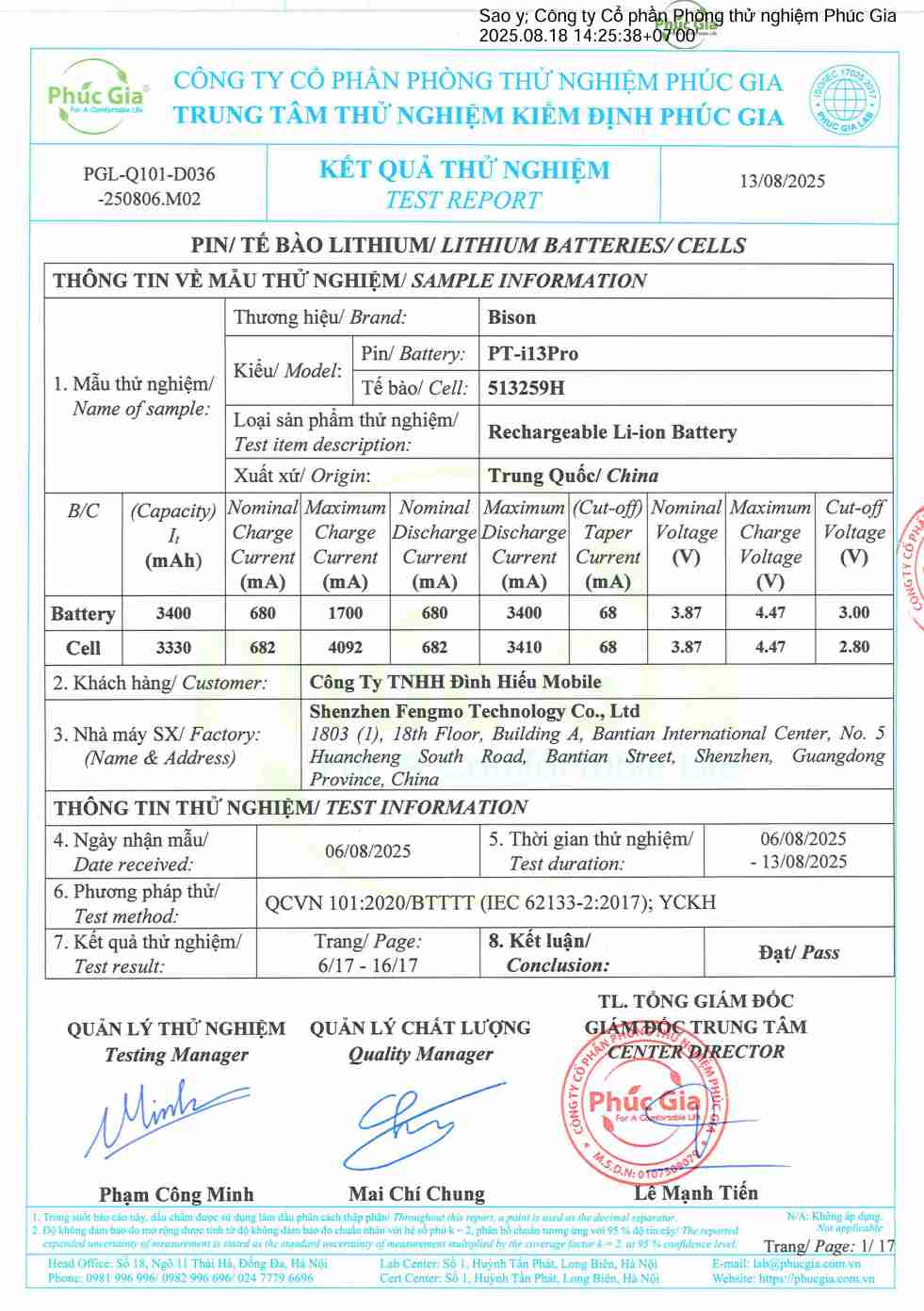 Xem thêm giấy tờ kiểm định full của Pin Bison iPhone 13, 13 Mini, 13 Pro, 13 Pro Max tại đây