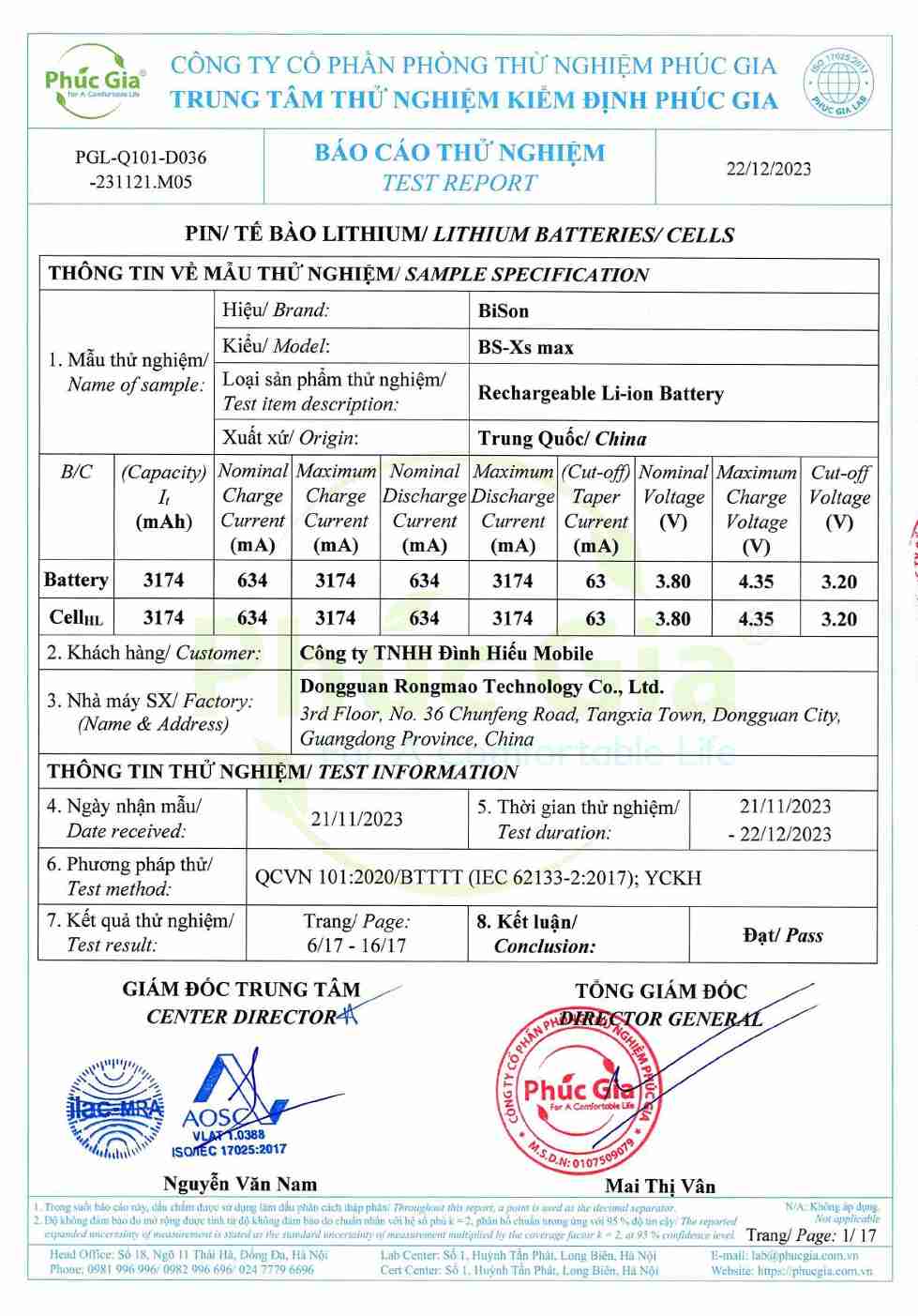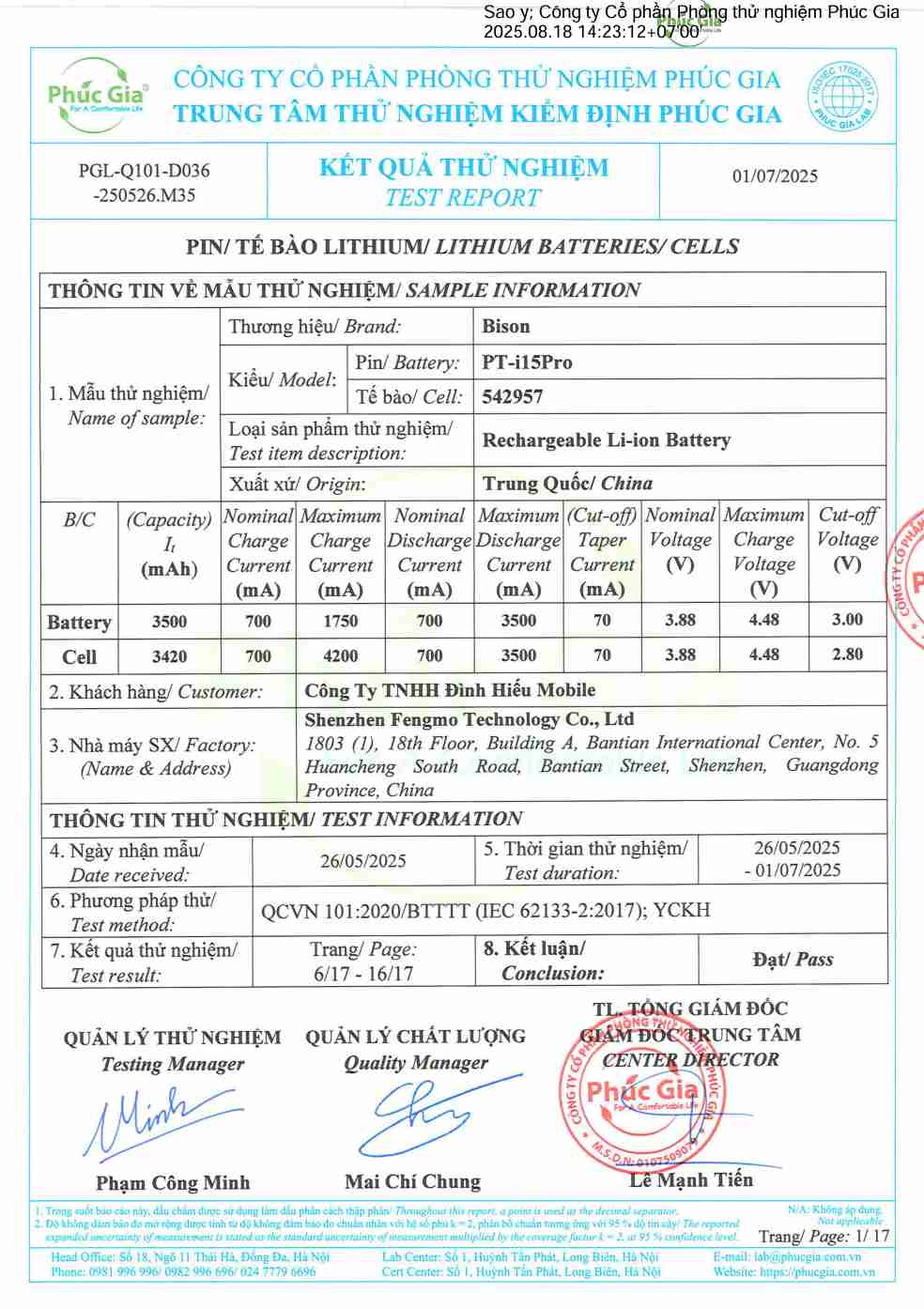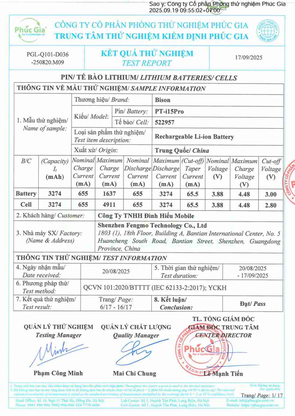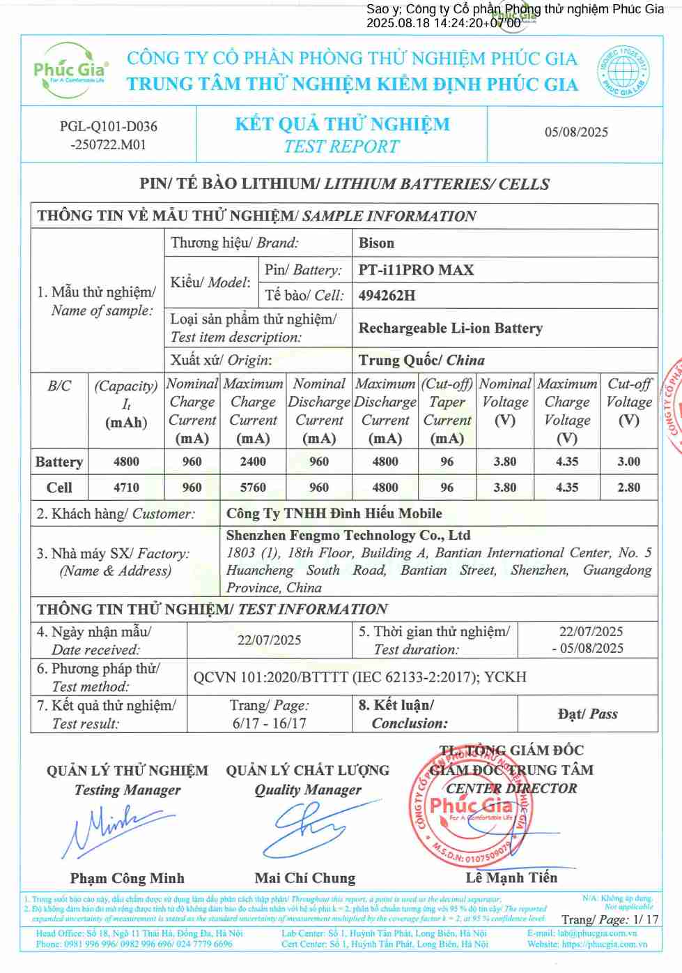 Xem thêm giấy tờ kiểm định full của Pin Bison iPhone 15, 15 Plus, 15 Pro, 15 Pro Max tại đây
