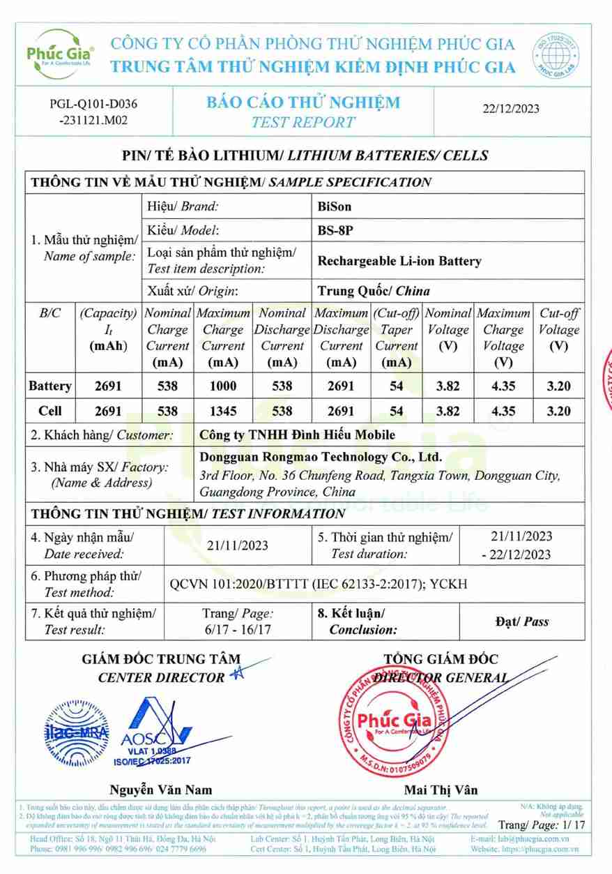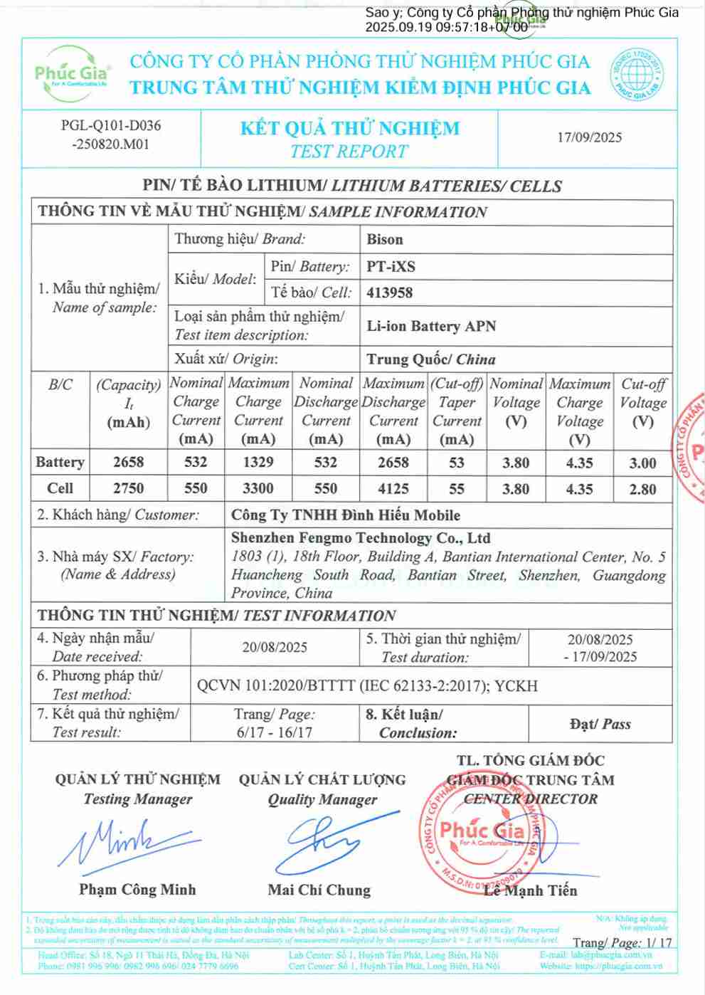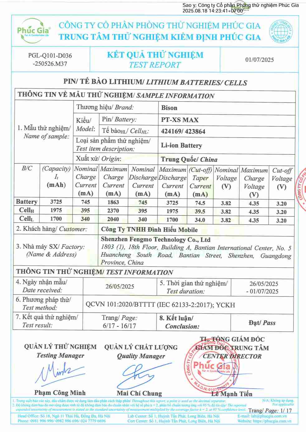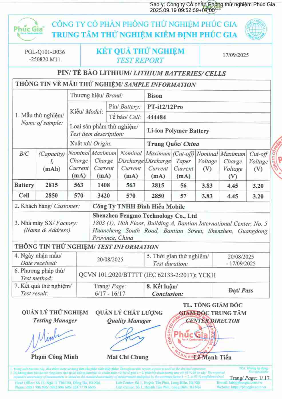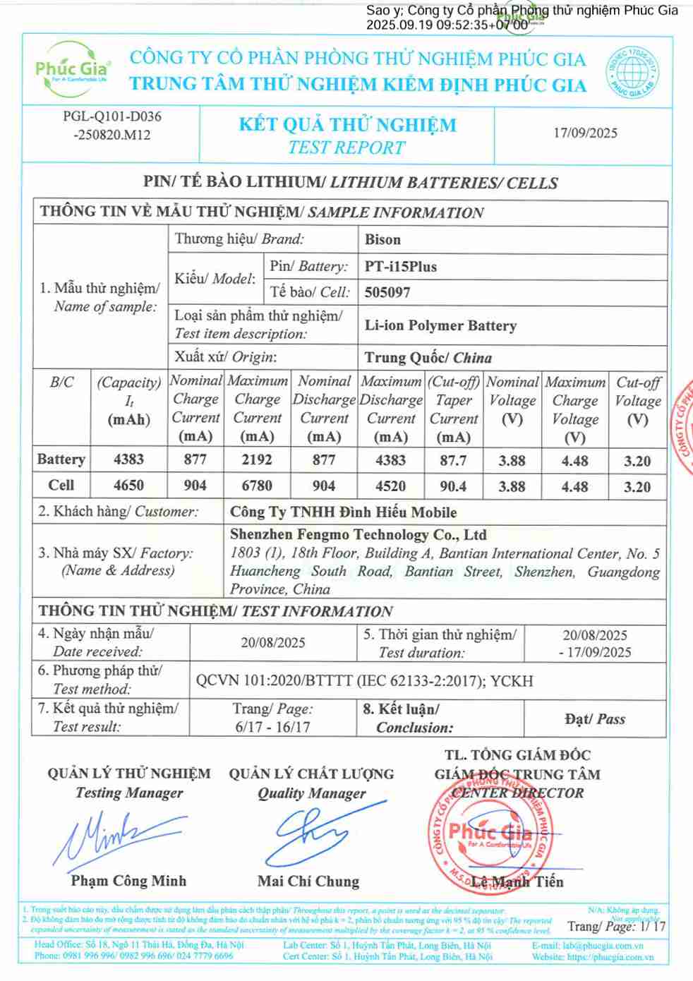 Xem thêm giấy tờ kiểm định full của Pin Bison iPhone 15, 15 Plus, 15 Pro, 15 Pro Max tại đây