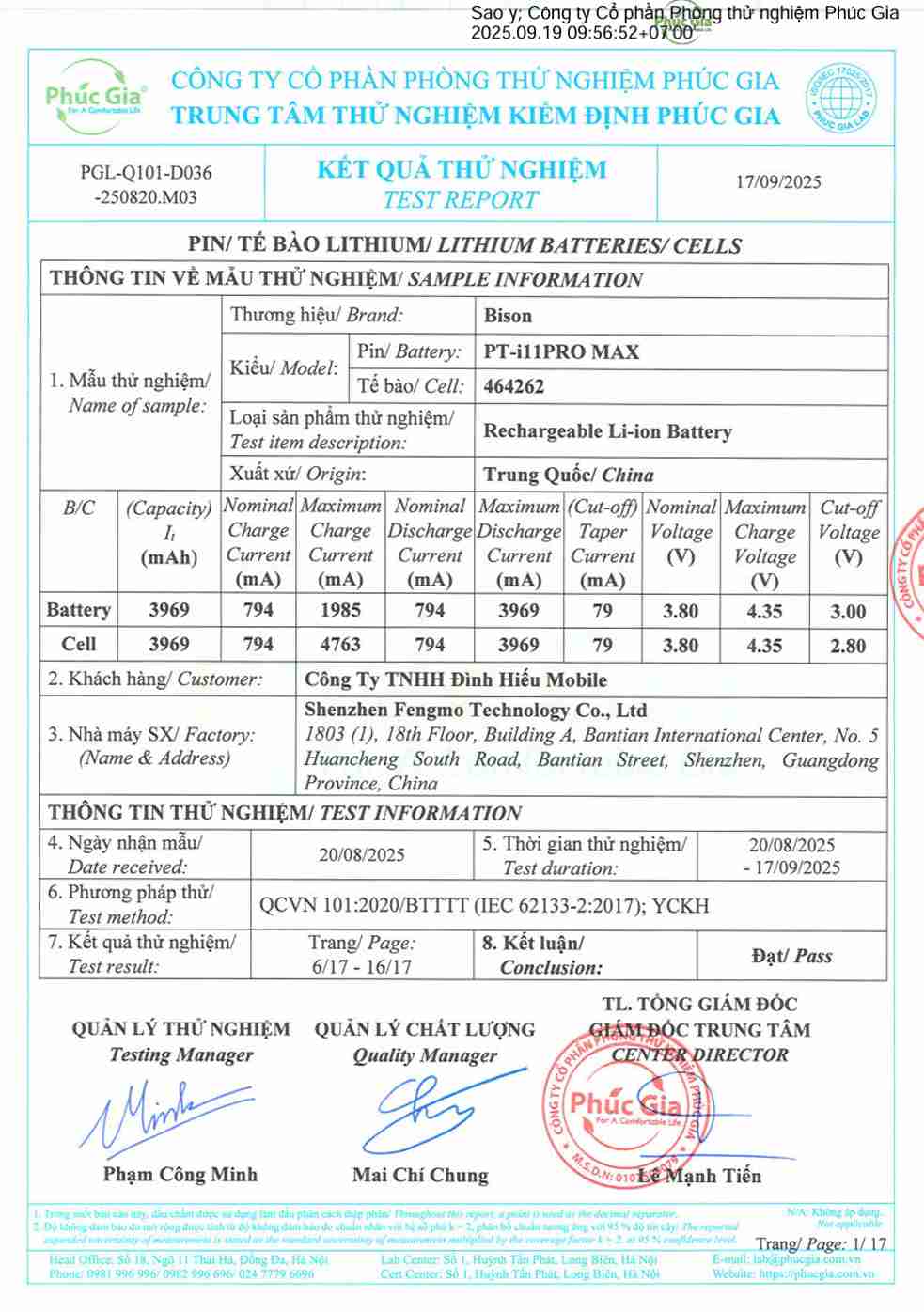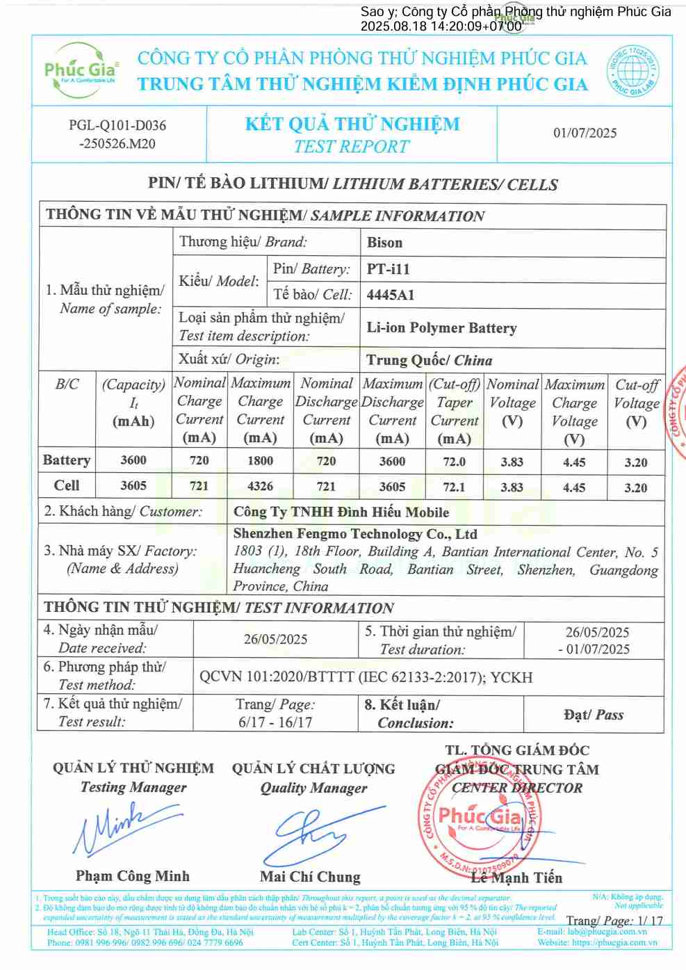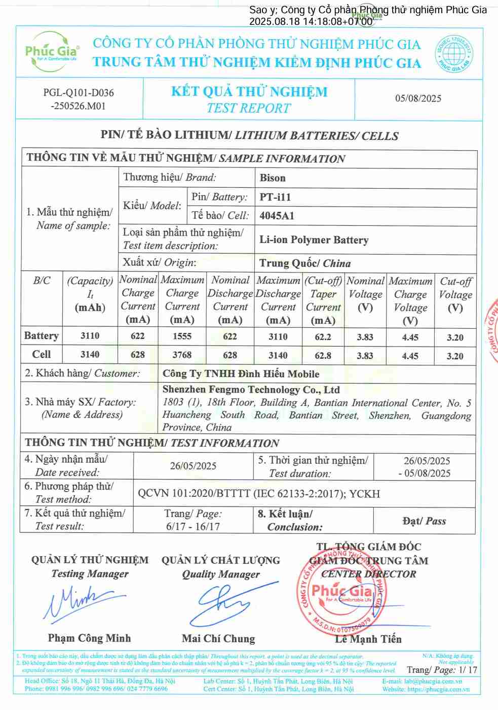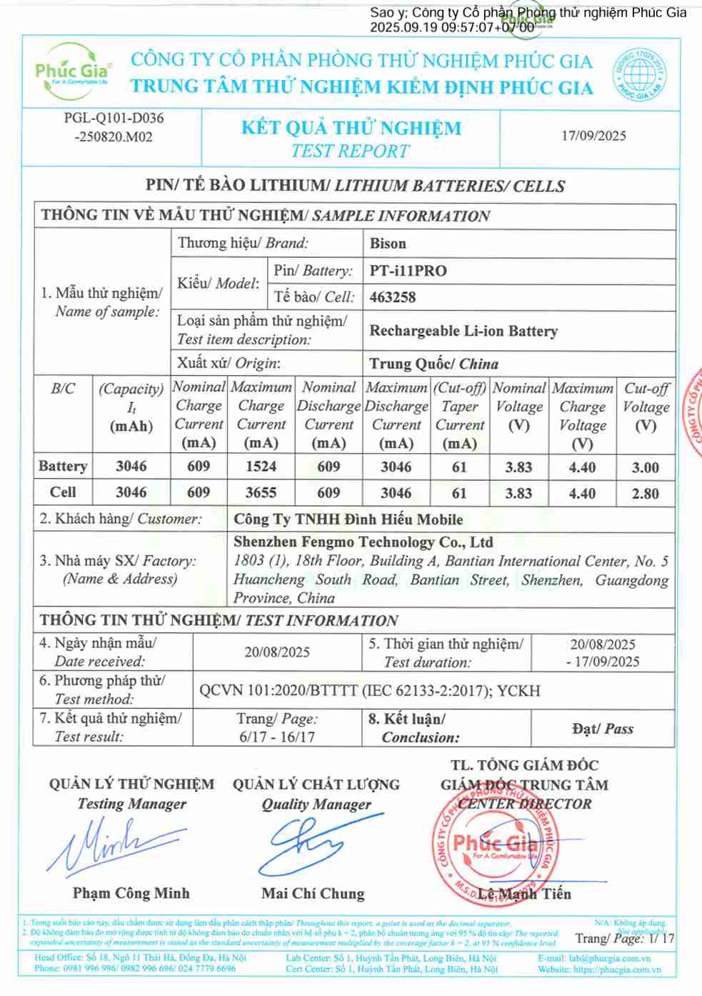 Xem thêm giấy tờ kiểm định full của Pin Bison iPhone 11, 11 Pro, 11 Pro Max tại đây