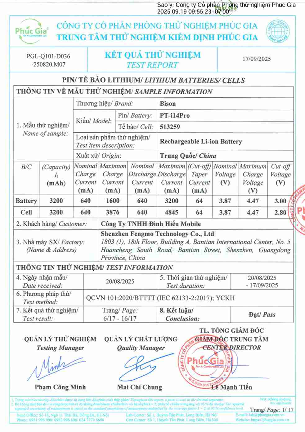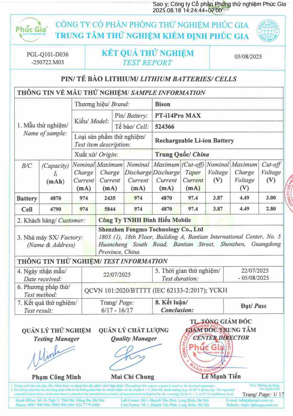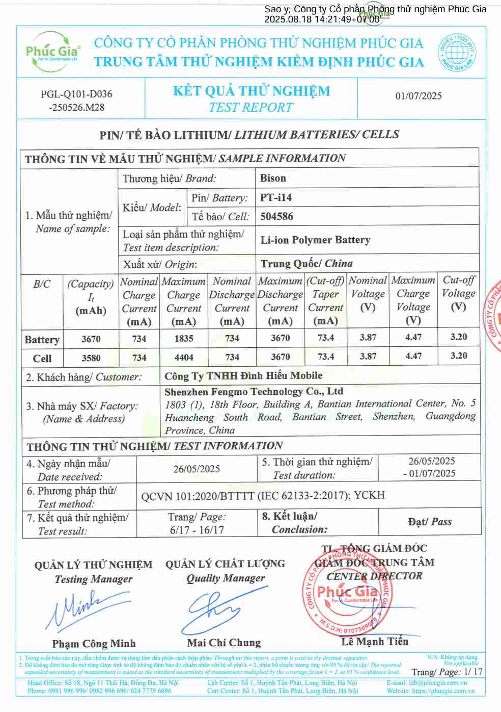 Xem thêm giấy tờ kiểm định full của Pin Bison iPhone 14, 14 Plus, 14 Pro, 14 Pro Max tại đây