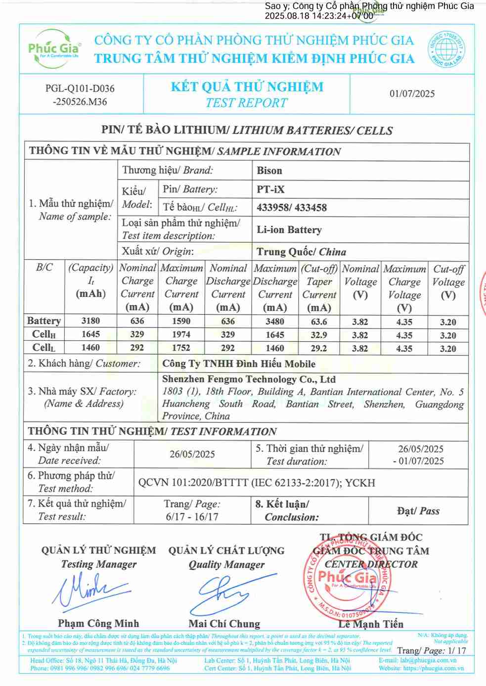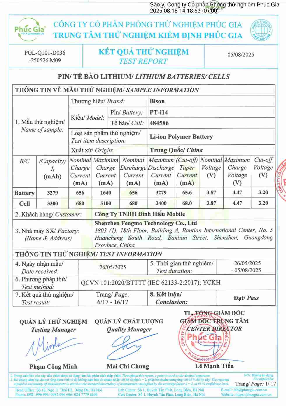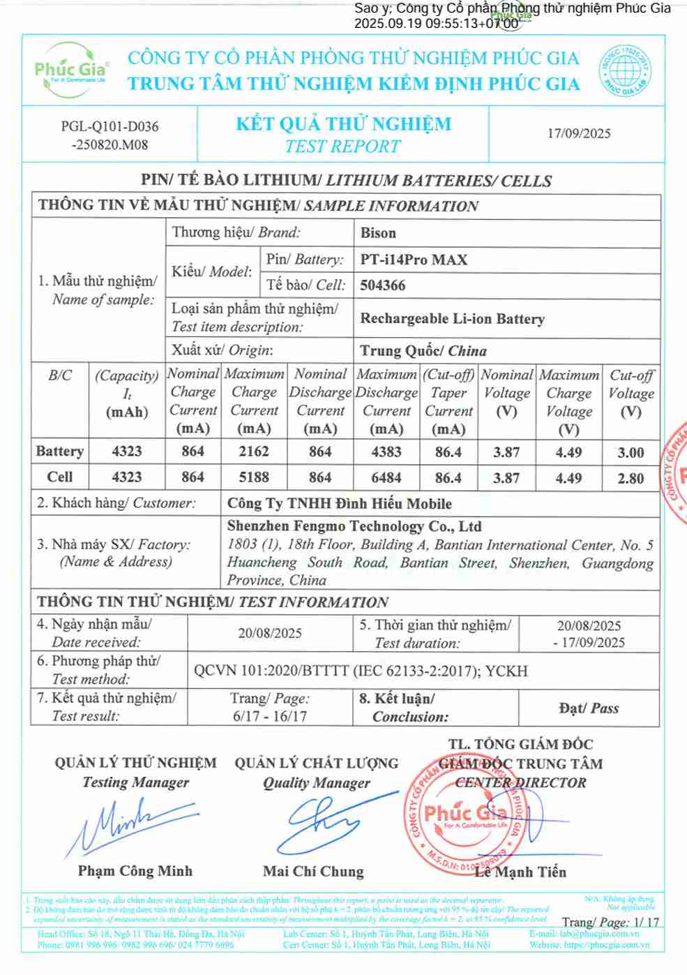 Xem thêm giấy tờ kiểm định full của Pin Bison iPhone 14, 14 Plus, 14 Pro, 14 Pro Max tại đây