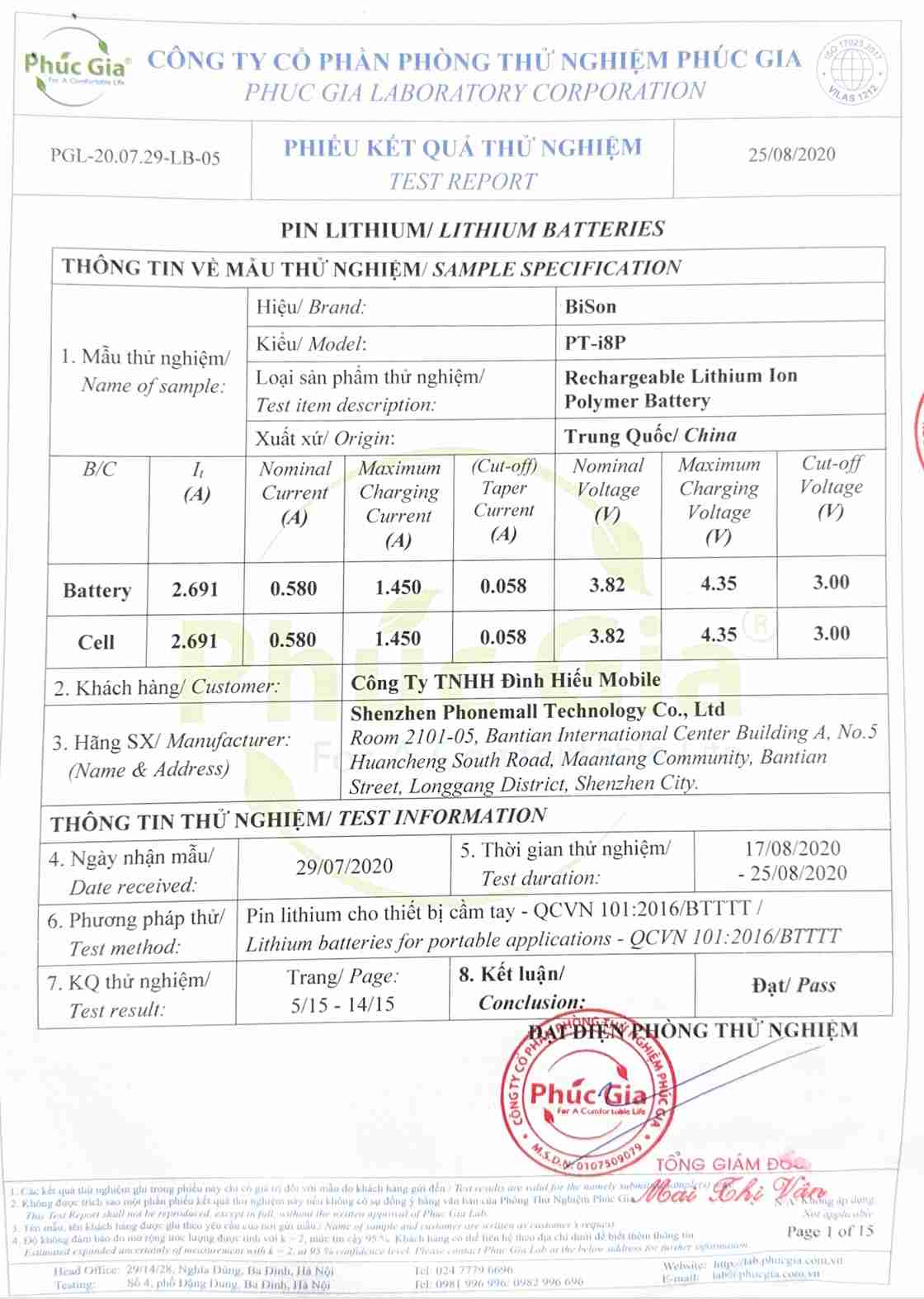 Xem thêm giấy tờ kiểm định full của Pin Bison iPhone 7 Plus, 8 Plus, SE 2020, SE 2022 trở về trước tại đây
