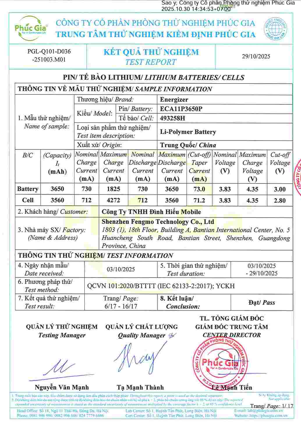 • Giấy tờ kiểm định Pin Energizer Ultimate Replacement Mobile Battery đạt tiêu chuẩn Việt Nam xem thêm bản full PDF toàn bộ tại đây
