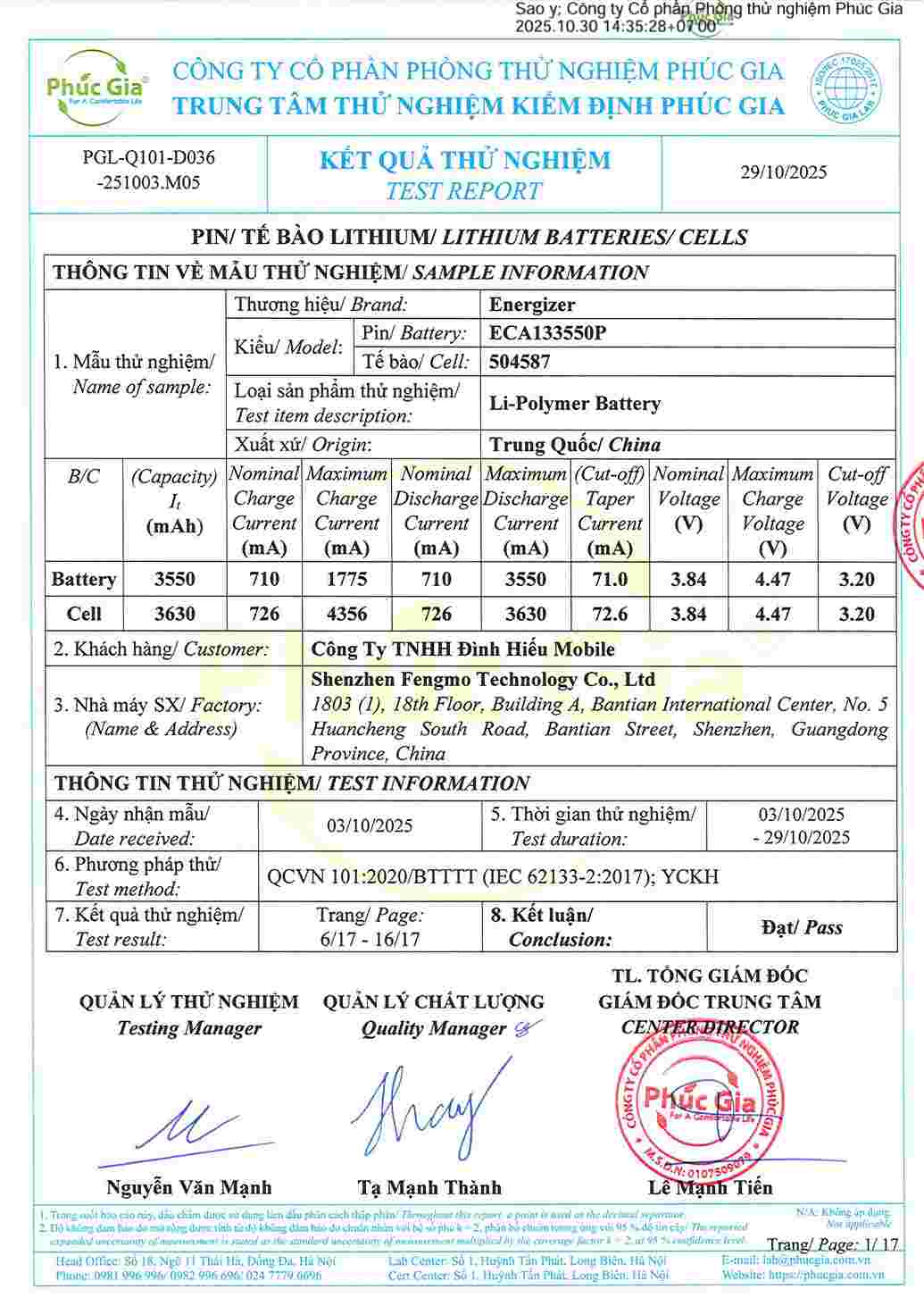 • Giấy tờ kiểm định Pin Energizer Ultimate Replacement Mobile Battery đạt tiêu chuẩn Việt Nam xem thêm bản full PDF toàn bộ tại đây