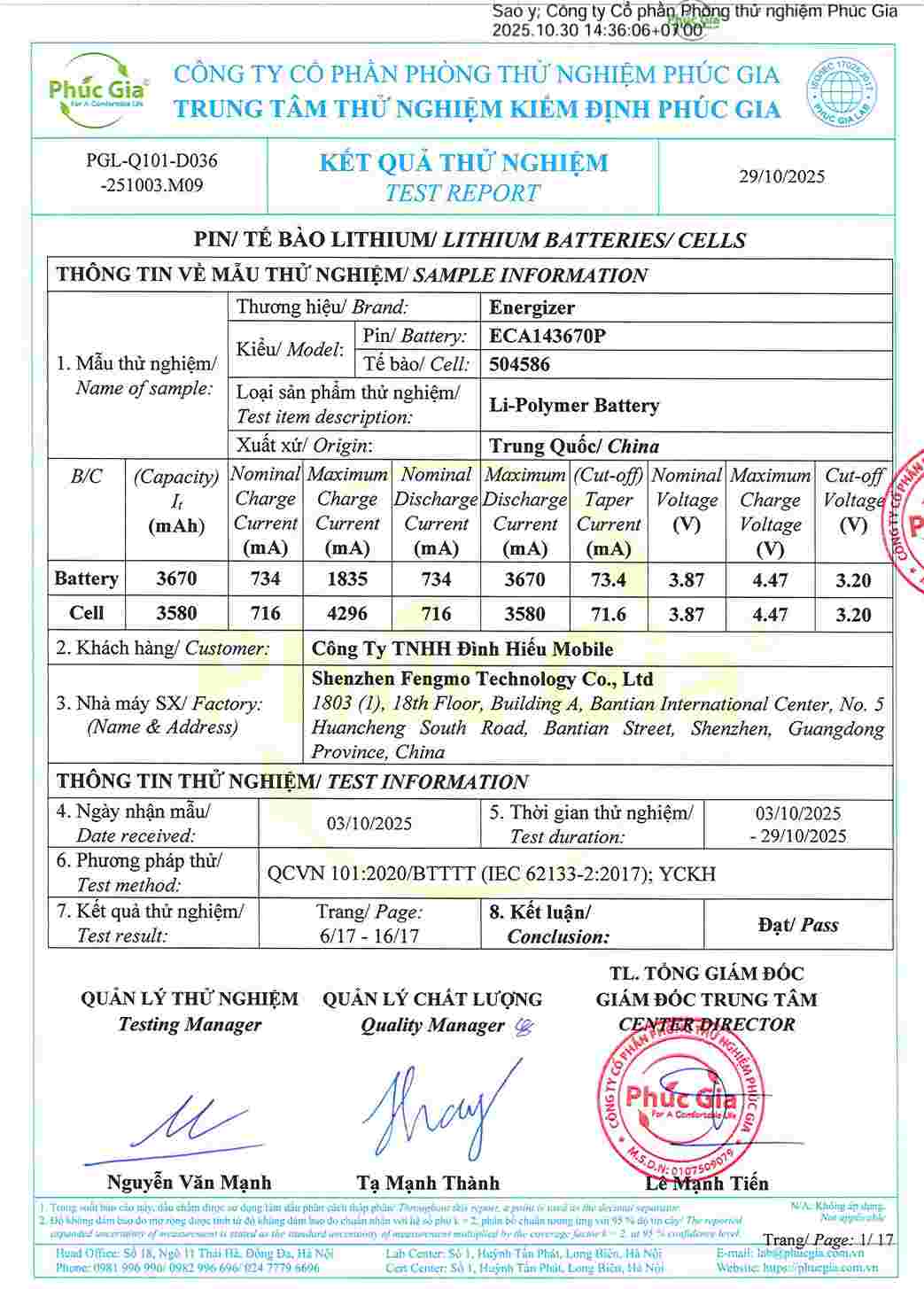 • Giấy tờ kiểm định Pin Energizer Ultimate Replacement Mobile Battery đạt tiêu chuẩn Việt Nam xem thêm bản full PDF toàn bộ tại đây