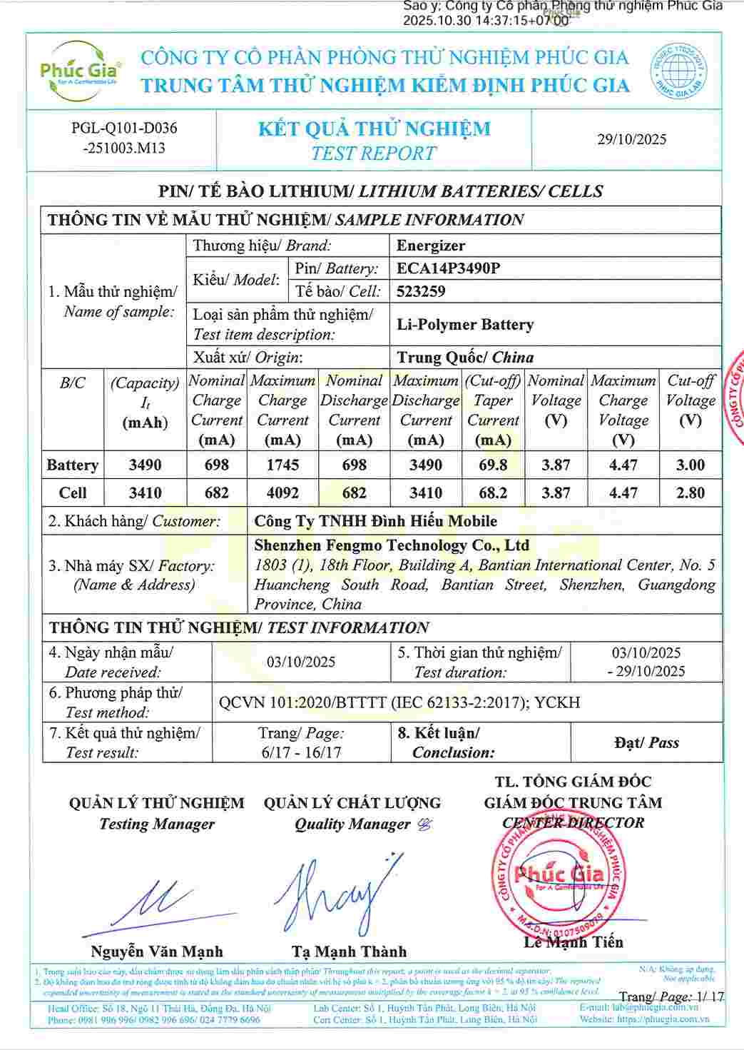 Xem thêm giấy tờ kiểm định full Pin Energizer iPhone 14, 14 Plus, 14 Pro, 14 Pro Max tại đây