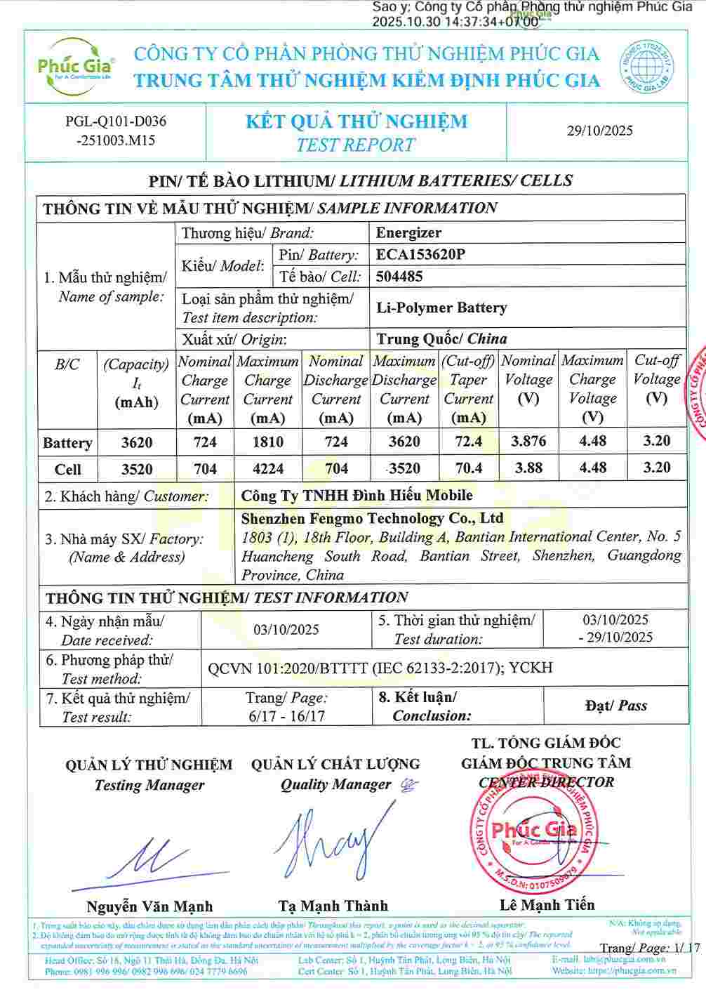 • Giấy tờ kiểm định Pin Energizer Ultimate Replacement Mobile Battery đạt tiêu chuẩn Việt Nam xem thêm bản full PDF toàn bộ tại đây