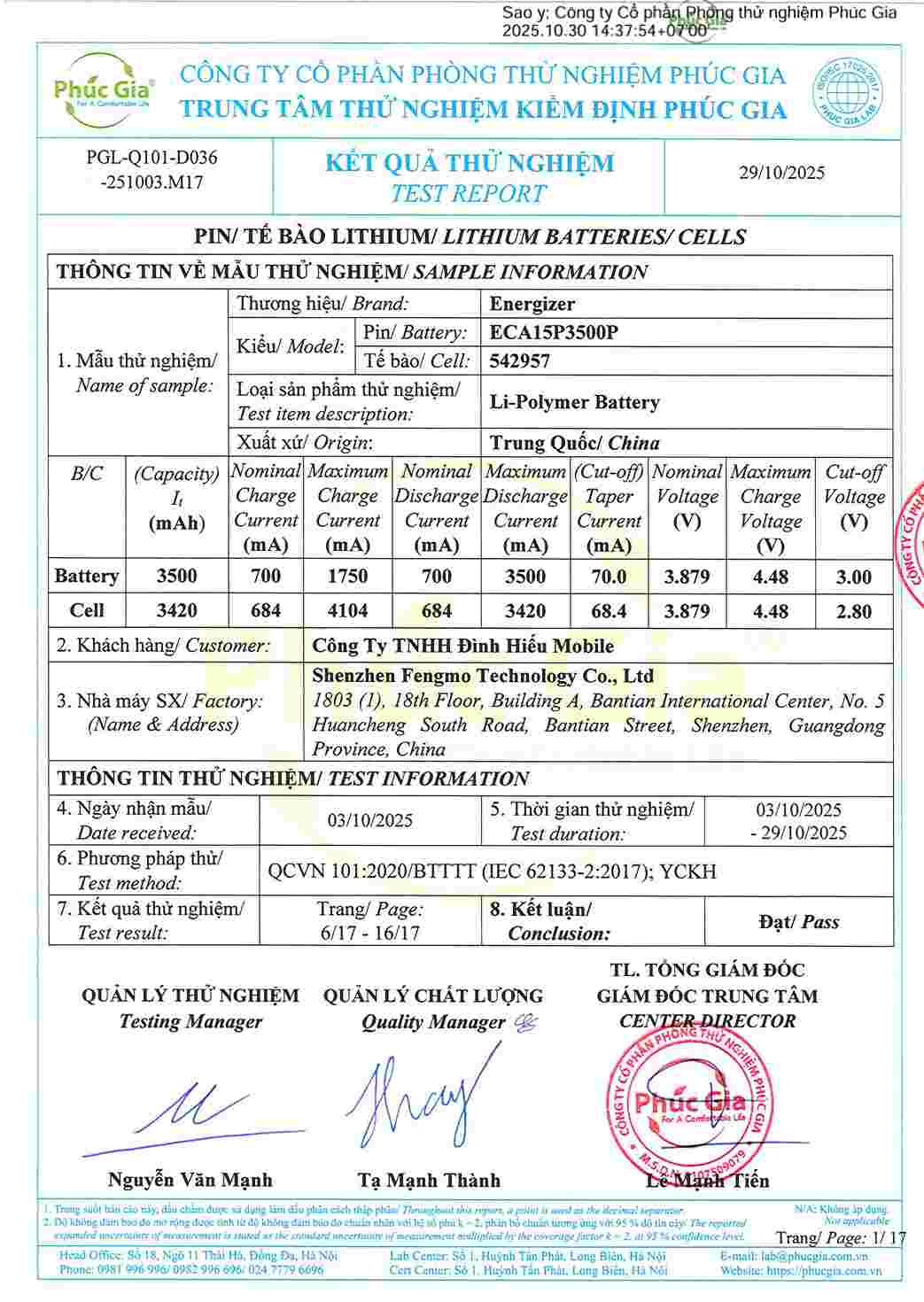 • Giấy tờ kiểm định Pin Energizer Ultimate Replacement Mobile Battery đạt tiêu chuẩn Việt Nam xem thêm bản full PDF toàn bộ tại đây