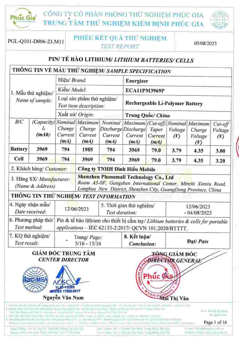 • Giấy tờ kiểm định Pin Energizer Ultimate Replacement Mobile Battery đạt tiêu chuẩn Việt Nam xem thêm bản full PDF toàn bộ tại đây