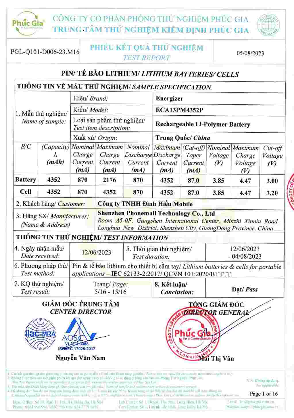 • Giấy tờ kiểm định Pin Energizer Ultimate Replacement Mobile Battery đạt tiêu chuẩn Việt Nam xem thêm bản full PDF toàn bộ tại đây