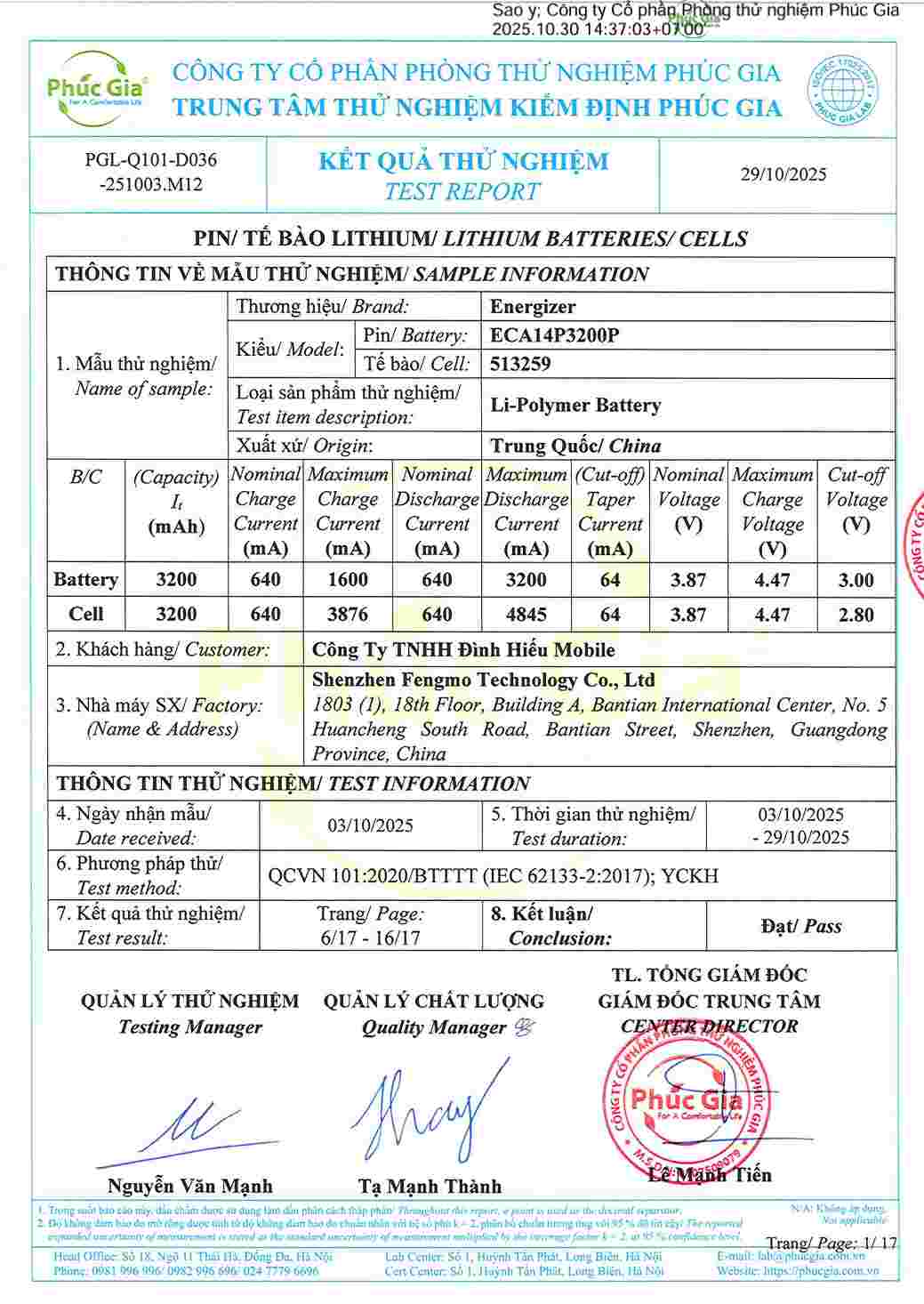 Xem thêm giấy tờ kiểm định full Pin Energizer iPhone 14, 14 Plus, 14 Pro, 14 Pro Max tại đây