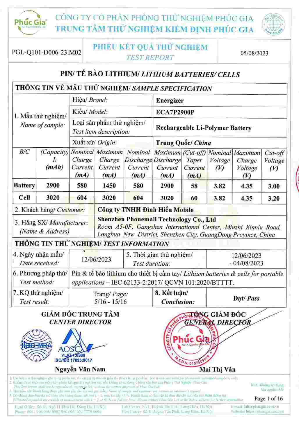 • Giấy tờ kiểm định Pin Energizer Ultimate Replacement Mobile Battery đạt tiêu chuẩn Việt Nam xem thêm bản full PDF toàn bộ tại đây