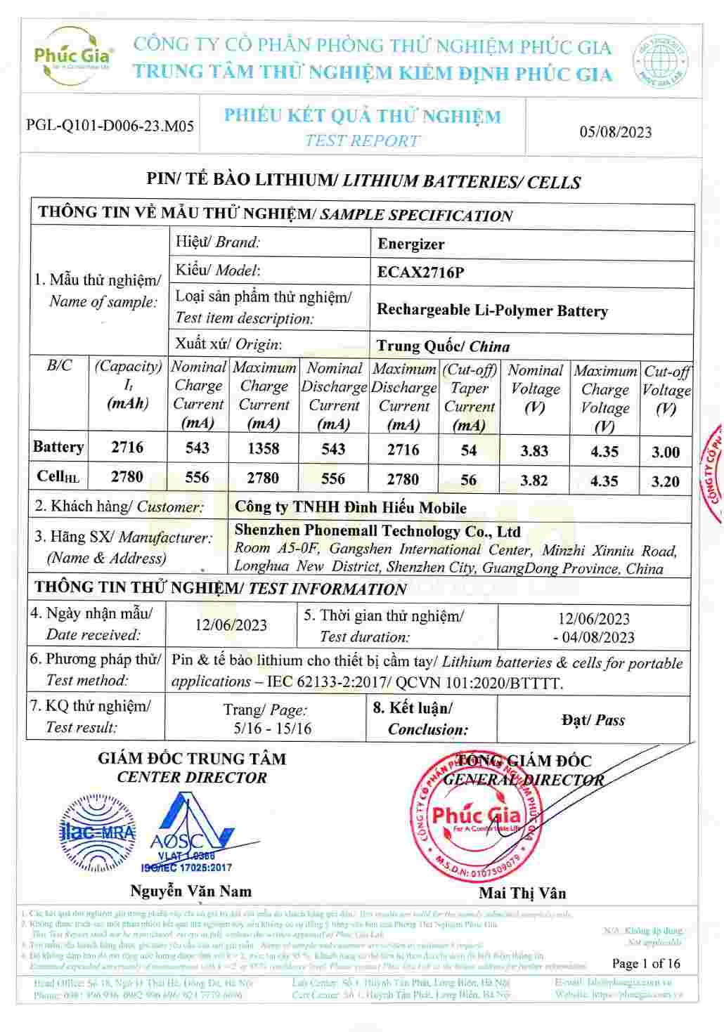 • Giấy tờ kiểm định Pin Energizer Ultimate Replacement Mobile Battery đạt tiêu chuẩn Việt Nam xem thêm bản full PDF toàn bộ tại đây